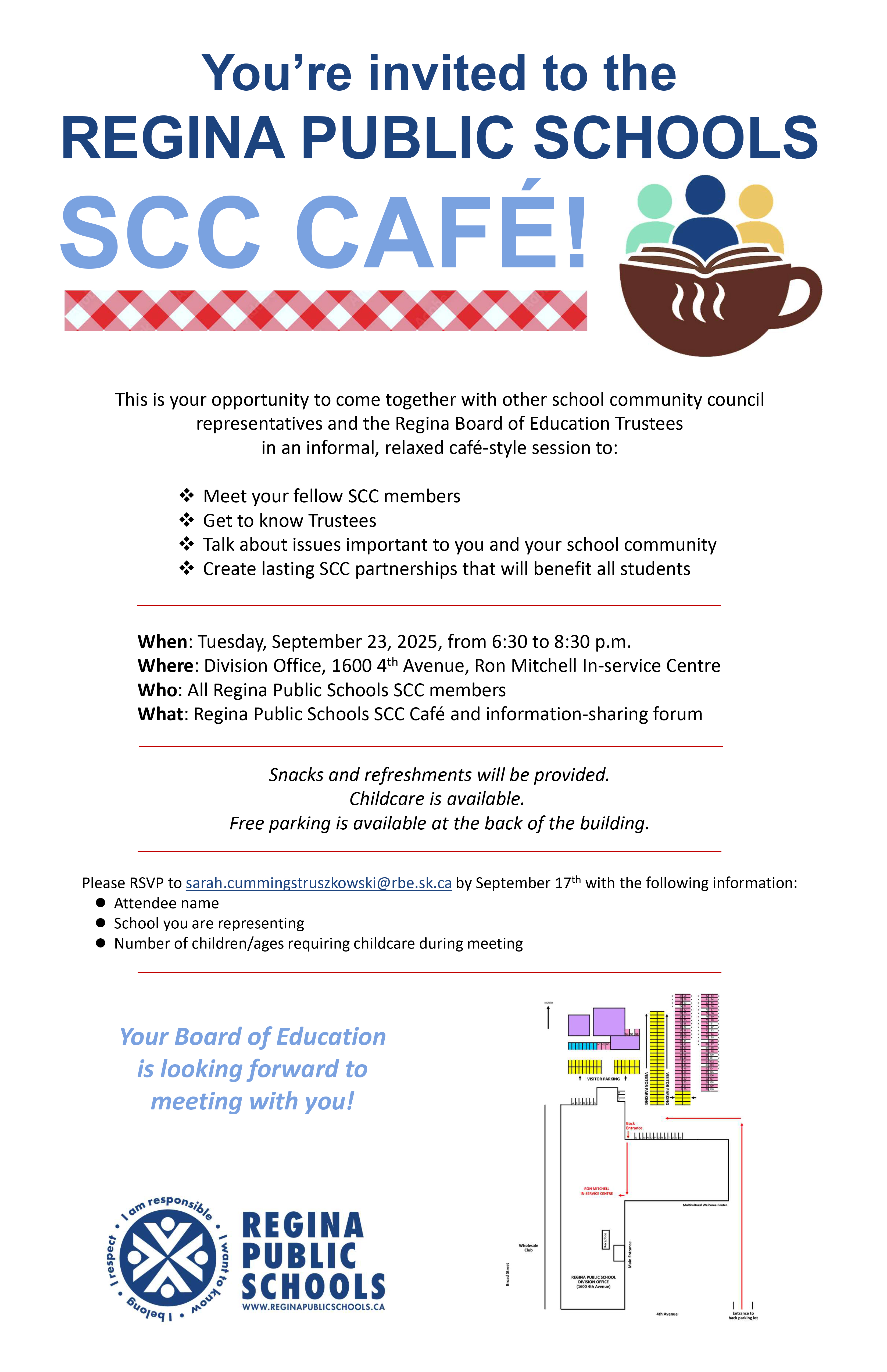 AUGUST 19, 2025—School Community Council members are invited to attend the Regina Public Schools SCC Café on Tuesday, September 23, 2025, from 6:30 to 8:30 p.m. at Division Office (1600 4th Avenue).